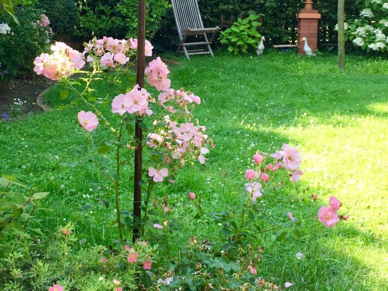 Direkt an der Terrasse: eine „Queen Mother“, die ich letztes Jahr aus UK mitgebracht habe. Mit deutlich mehr Laub versehen als es auf dem Foto den Anschein hat, scheinen ihre Blüten zu schweben und vermitteln eine filigrane Zerbrechlichkeit, die anrührend ist. Zugleich umwebt sie charmant die Einfachheit des Laternenhalters. Mein Herz hat sie gestohlen.