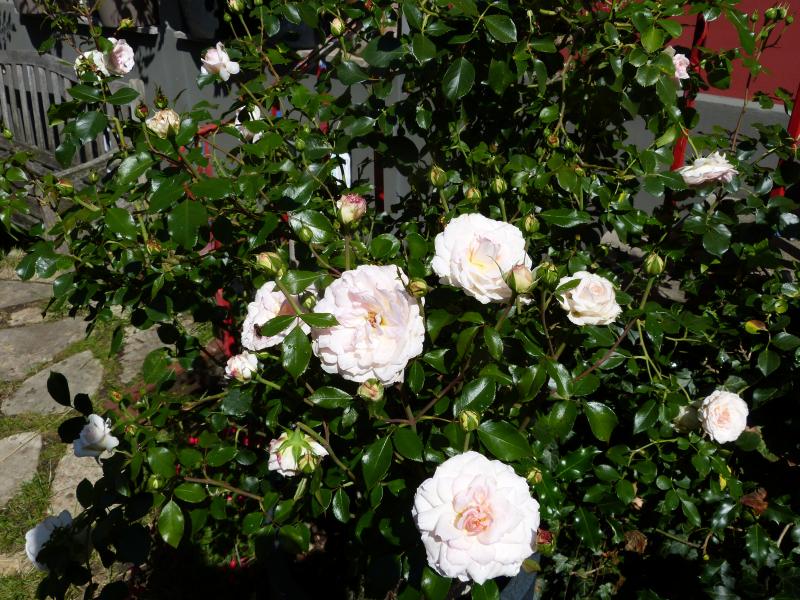Ich habe auch ein paar Rosen fotografiert.Zuerst einmal eine Blütendolde von Caramella.Hier unermüdlich blühend.Leider ist das Laub ziemlich angegriffen,was in anderen Jahren nicht so auffiel.