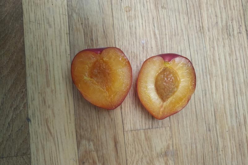 Fruchtfleisch Aprikosenfarben, gute Säure, Zuckergehalt über 14% (wie süße Aprikosen)