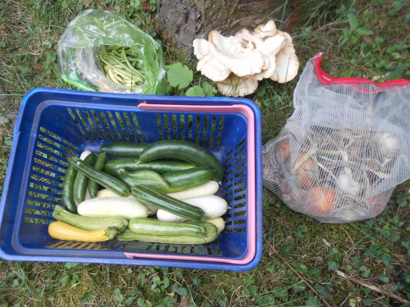 Grüne und gelbe Zucchini, grüne und weiße Gurken, grüne und gelbe Buschbohnen, gelbe und weiße Zwiebeln. Den Pilz habe ich nicht geerntet. Tochter sagt zwar, er sei essbar, aber ich traue mich nicht. Die ca. 1 kg Brombeeren fehlen.