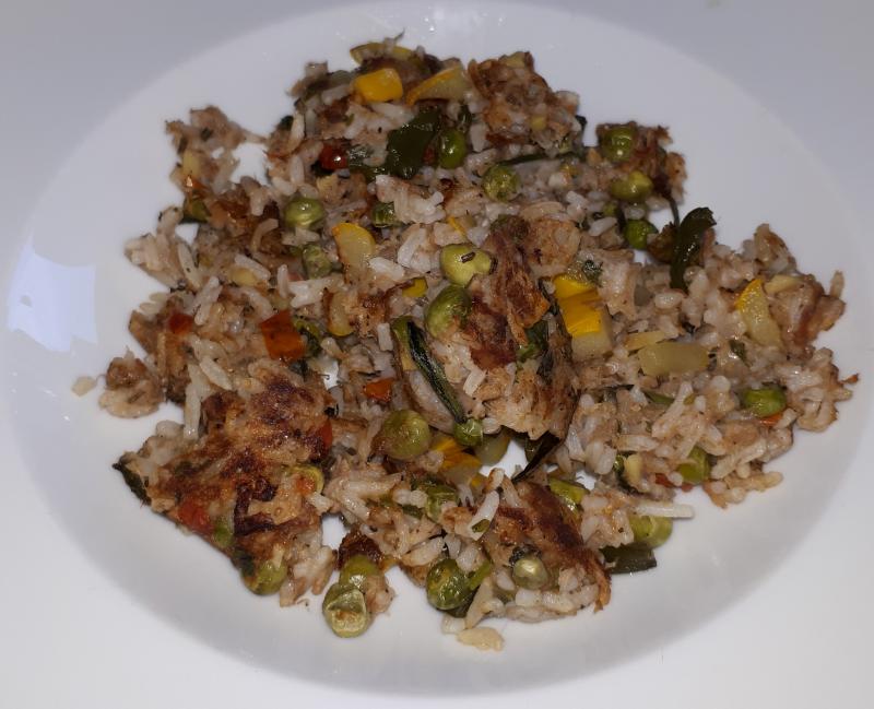 Gebratener Reis mit Thunfisch, Zucchini, Erbsen und Lauchzwiebeln, Gurkensalat.