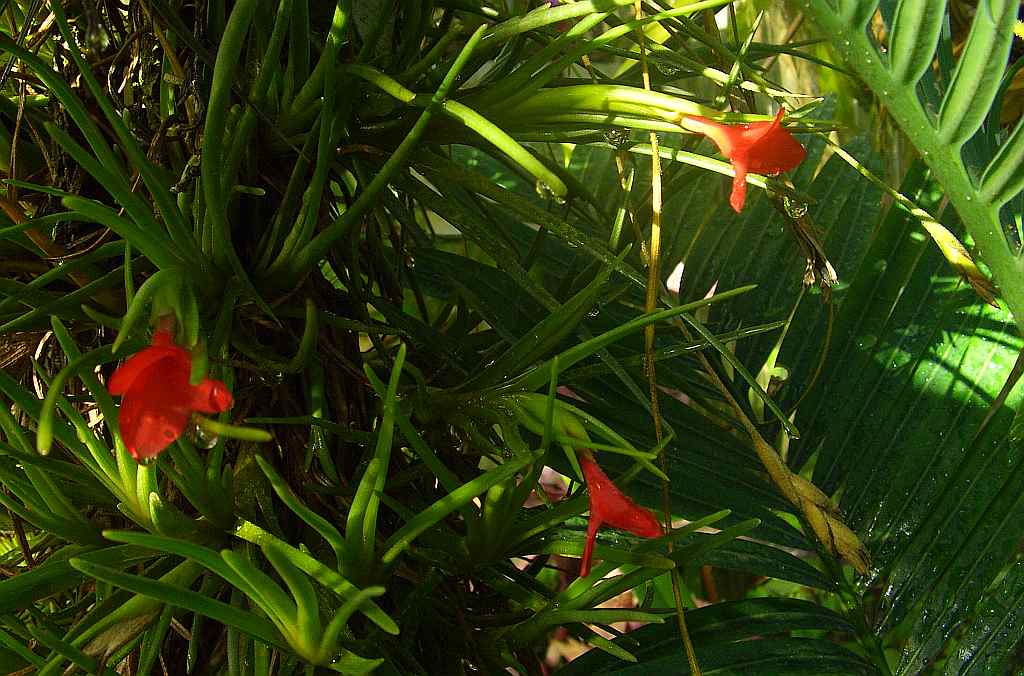Immer wieder kommen diverse Tillandsia-Arten zur Blüte. Oft sind die Blüten leider nur sehr kurzlebig, aber schön sind die meisten, wie etwa die kräftig roten der Tillandsia albertiana hier.