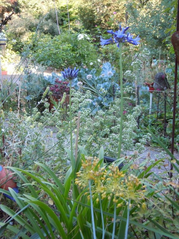 Agapanthus "Sämling von Midnight Star", dazu Origanum x majoricum (leider steril, und wächst kaum vom Fleck), reinweiß und ewig blühend. Sehr scharf aromareich.