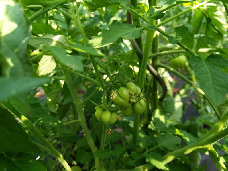 Dort sind auch die Früchte noch hinter denen im Hochbeet her. Hier ein Bild der Reisetomate.