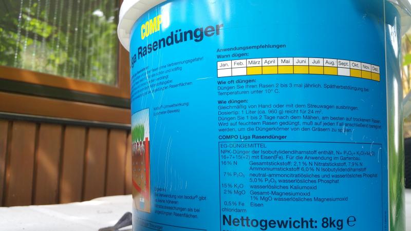 Den Dünger da habe ich verwendet. Den habe ich mitgekauft mit dem Rasen. Und dem Haus, ;D