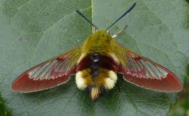 Ich habe den Hummelschwärmer auf einem Rosenblatt sitzen sehen. Hat sich kaum gerührt.