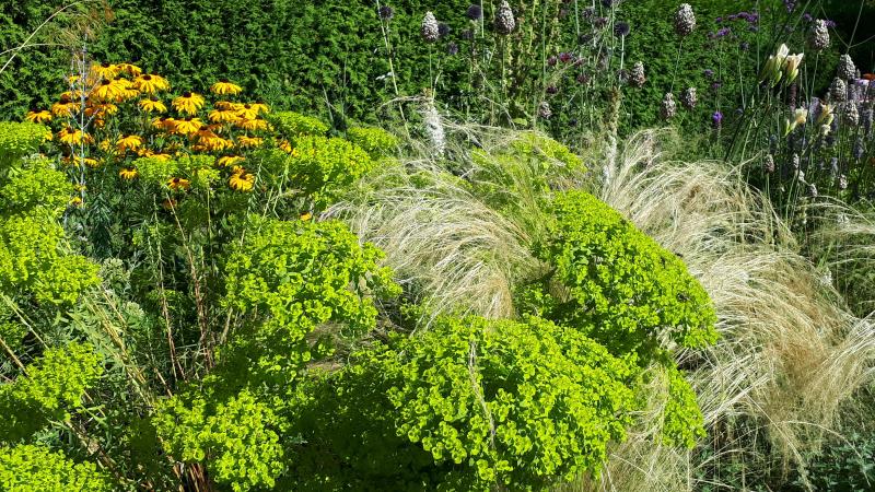 Szenerie am Boden mit Euphorbia seguieriana ssp. niciciana, Calamintha nepeta 'Triumphator' und den wunderschönen Blättern von Geranium 'Terre Franche '. :o