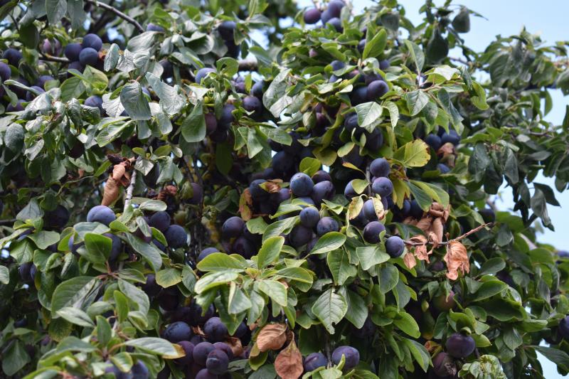 Die blauen rundlichen Früchte, bis ca 40 mm lang, ca 34 mm breit, mit schwacher Bauchnaht, gut steinlösend, werden langsam reif.