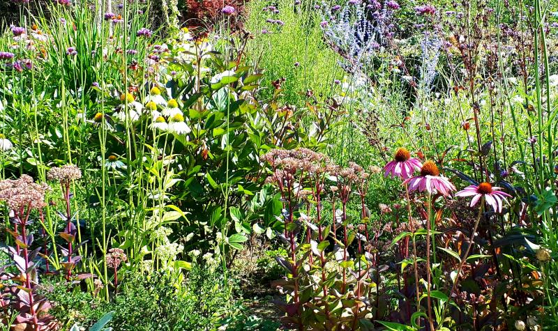 Klar, inzwischen etwas 'verwaschen' aber immernoch voll präsent: Echinacea . Hier dunkelrot begleitet von Sedum 'Matrona' und den Samenständen von Penstemon 'Husker Red'.