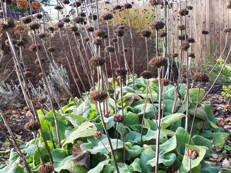 Phlomis russeliana ist hier längst durch mit der Blüte. Die Trockenresistenz bei der beziehe ich darauf, dass die Bodentriebe mit den neuen Rosetten gut überdauern, auch bei Trockenheit. Dass auch die abgeblühten Stengel grün stehen bleiben, erwarte ich nicht.