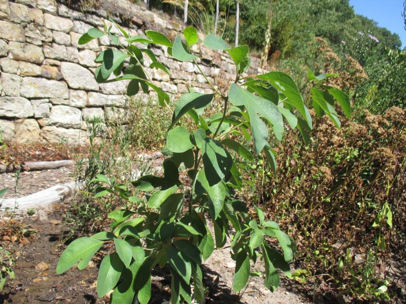 Oberhalb des Sassasfrasbaumes steht eine Oenothera, die habe ich im April gepflanzt und die muss noch ein wenig unterstützt werden. Ja, ich bekenne, ich habe sie gegossen und weil das Gelände, so wie bei mir überall, abschüssig ist, ist etwas Wasser an der Oberfläche abwärts gelaufen, bevor es eingedrungen ist. Doch ich bezweifle, dass Herr Sassasfras von den Zuwendungen an Frau Oenothera profitieren konnte. ;D