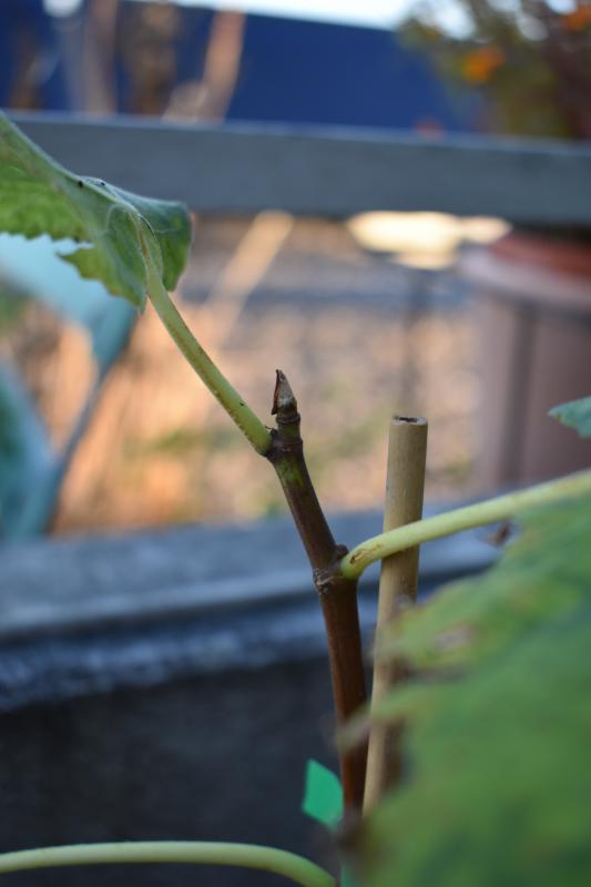 Ein sehr auffälliges Merkmal meiner Negronne ist, dass die Feigen ganz schwer vom Strauch lösen. Man muss schon mit dem Fingernagel richtig abkneifen, damit sie unverletzt vom Baum gehen. Durch den kurzen Hals und kurzen Stiel geht das bei einigen Früchten besonders blöd. Das habe ich so bei den anderen Feigensorten nicht gehabt. Zudem sind die Blattstiele rötlich angehaucht.