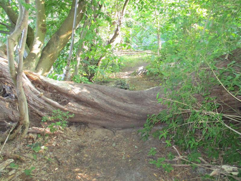 Musste also das Rad drüberwuchten. Nicht nur hier, sondern auch noch über zwei andere hüfthohe querliegende Baumstämme. Drumrum ging nicht - da Wasser, da dichtes Unterholz.