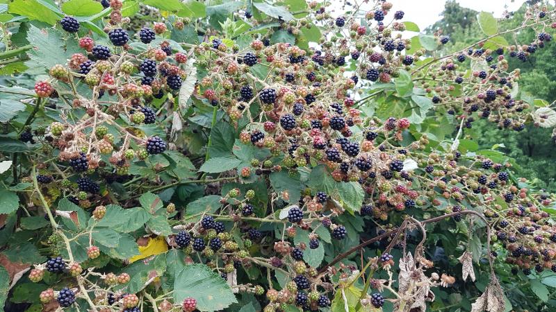Die Schlitzblättrige Brombeere (Oregon Evergreen) braucht noch etwas Zeit bis zur Hauptreife. Standort wie Sandbrombeere. Pflege besteht nur aus auslichten, abgetragene Ruten entfernen und mulchen.