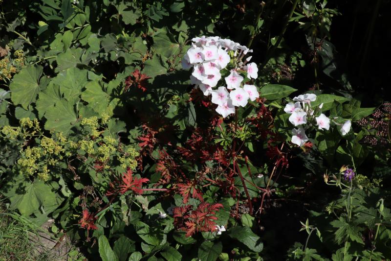 Nur wenige Blüher trotzen noch Hitze und Dürre -Geranium pratense garniert die Blüten von Phlox und Alchemilla mit Herbstlaub.