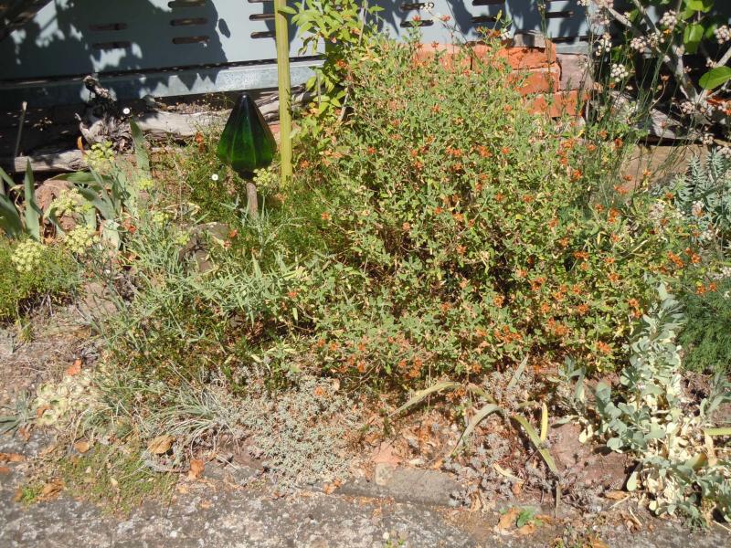 rechts hinten vor den Backsteinen auch brutzelfest: Euphorbia rigida.