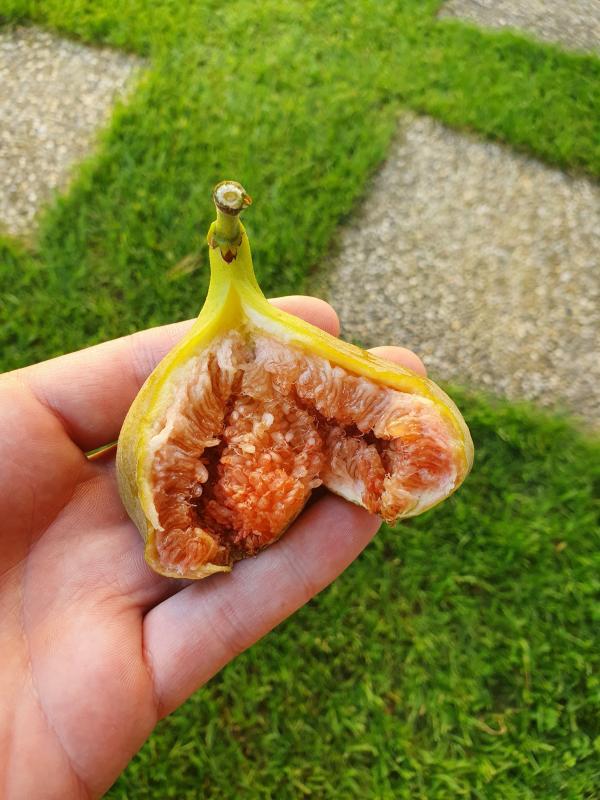 Die gestrige RdB habe ich zu früh gepflückt. War deshalb die schlechteste aller 2020er Feigen (Negronne, Brown Turkey, Firoma, falsche Brogiotto Nero). Dachte wegen der Risse in der Haut ist sie reif, dem war aber nicht so.