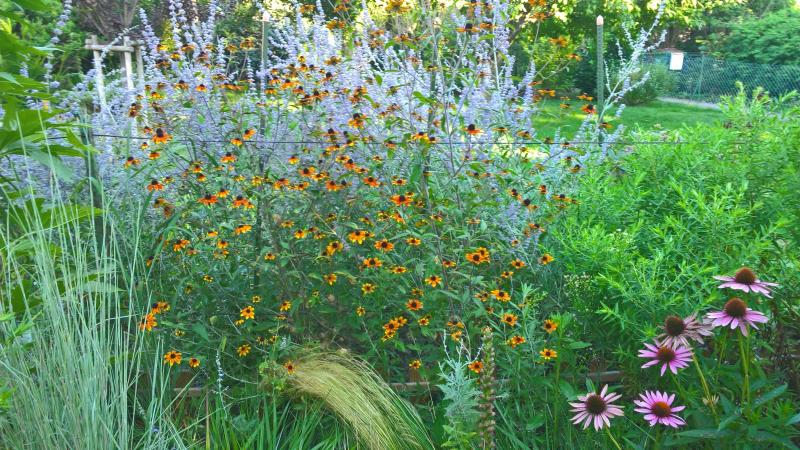 Und hier eine nette Kombi, die nicht so geplant war: Rudbeckia triloba "Prairie Glow", im Hintergrund die Perovskia der Nachbarin. Prairie Glow ist aus Samen gezogen, war allerdings eine schwere Geburt, da warte ich jetzt seit 3 Jahren auf Blüten. Hat sich aber gelohnt ;D