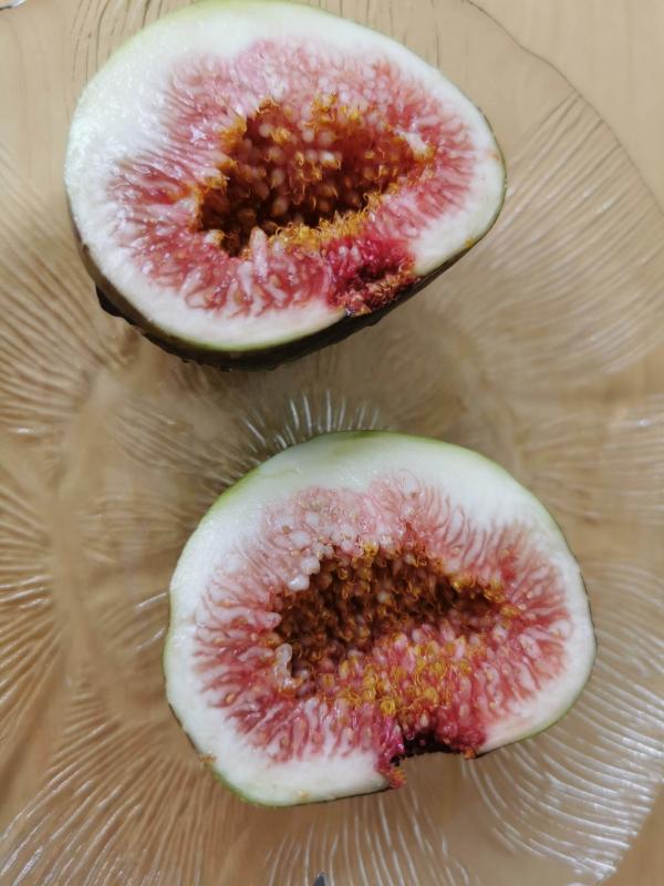 Ganze Feige: schmeckte sehr gut, die reifen weichen saftigen Teile am Rand zumindest.
