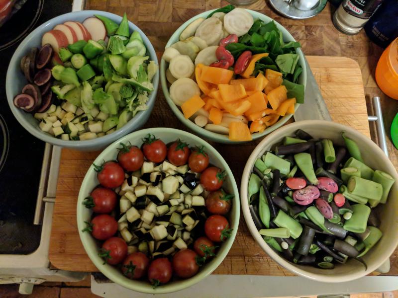 Ein grosses Becken Tomaten. Randen, Bohnen und Gurken. Jetzt muss ich auch in die Küche.