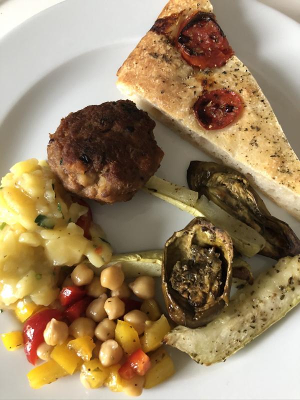Heute Fleischküchle mit den restlichen Salaten, Zucchini und Auberginen als Antipasti und Kartoffelfladenbrot dazu