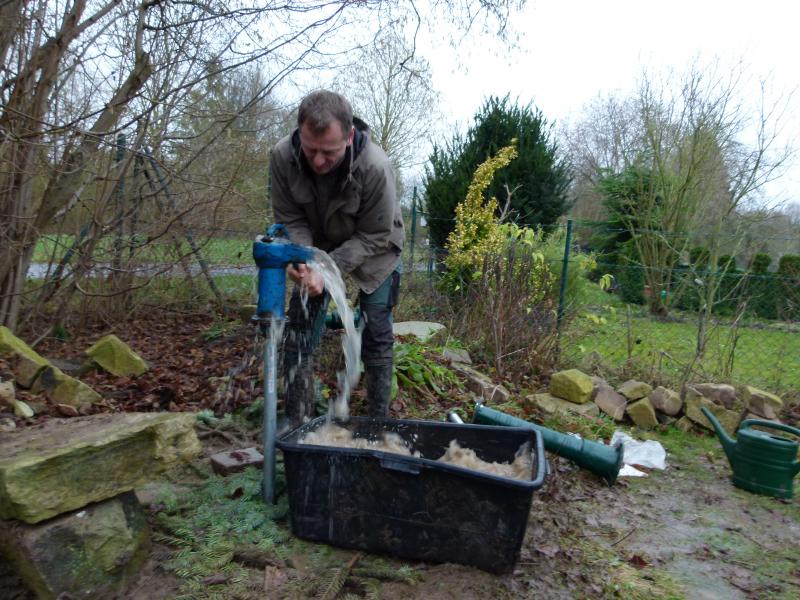 Hier sieht man einen glücklichen Gartenbesitzer, denn es hat geklappt: klares Wasser strömt nach, wir haben eine Schicht erreicht, die geeignet ist!