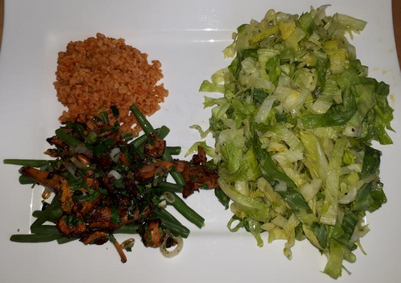 Gebratene Pfifferlinge auf grünen Bohnen, Bulgur, Römersalat