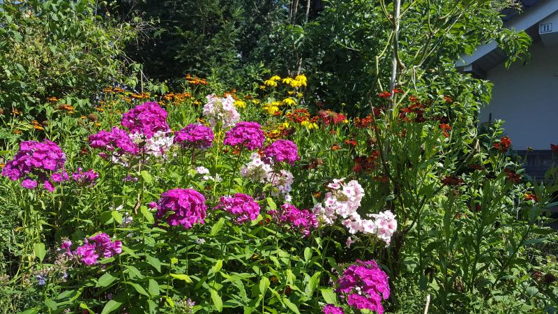 Die gelbrotorange Blütenwelt der Helenien dominiert hier so langsam die Szene, im Hintergrund Rudbeckien