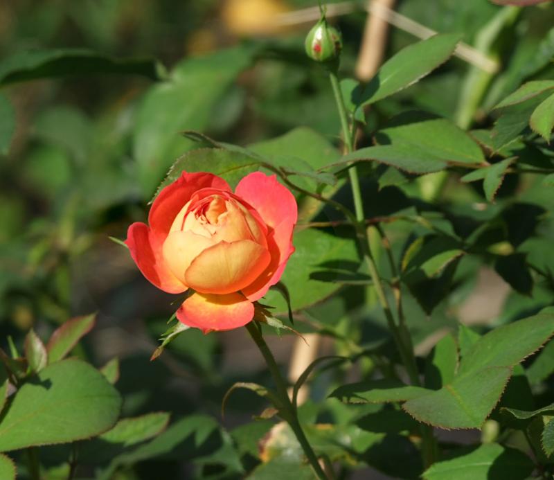 'Lady Emma Hamilton'von Austin.Der dunkelrote Blattaustrieb passt gut zur orangenen Blüte.