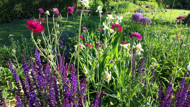 Das ist nur ein Ausschnitt des Beets. Das gesamte Beet ist ca. 9 m lang und 2,5 - 3 m breit. Die Grössenverhältnisse stimmen nicht ganz, mir geht es nur um Farbe und Form der Blüten