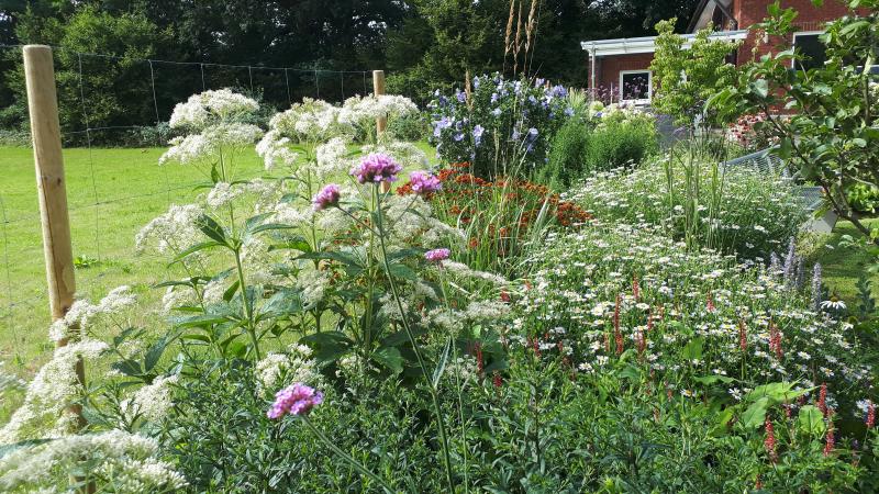Es geht im neuen Beet mit der hohen Grenzpflanzung los. Hier, wie schon gesagt, Euphratorium 'Bartered Bride', Kalimeris incisa 'Madiva', Helenium 'Baudirektor Linne' und Bistorta Amplexicaule 'Orangofield'. :o