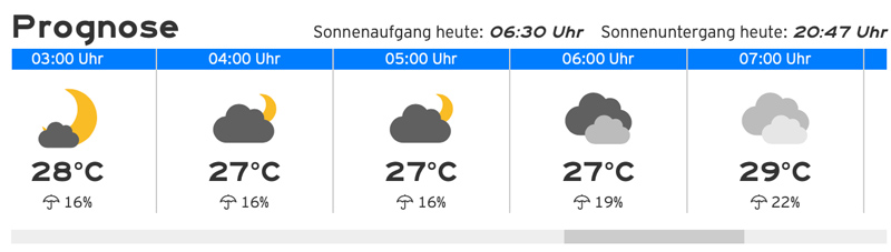 Momentan ist es ziemlich bewölkt bei 18.7 Grad. Tmax für heute ist 30-31 Grad.