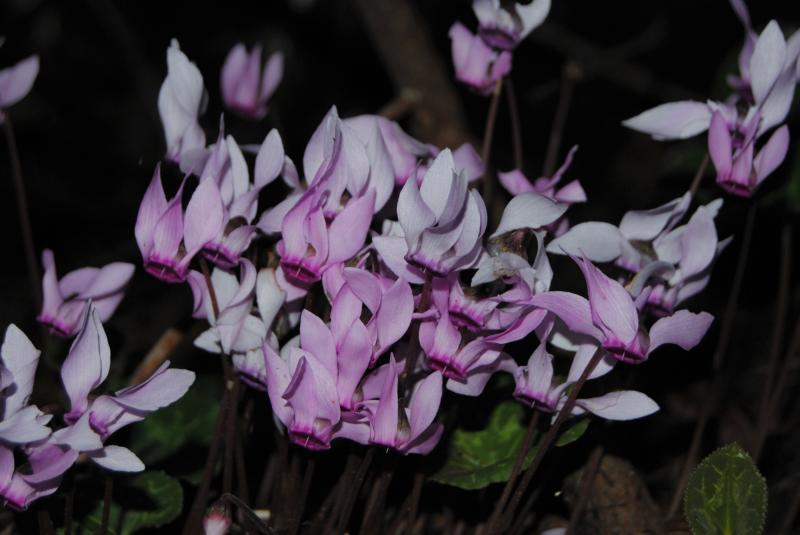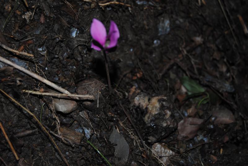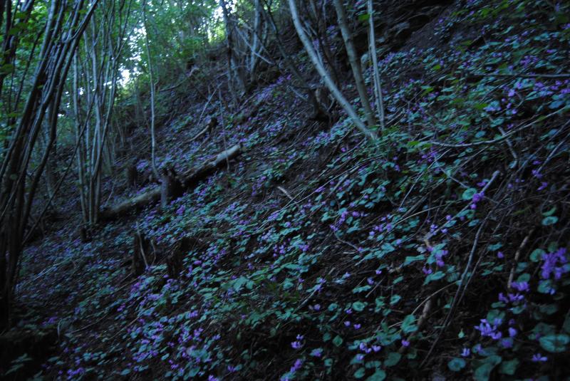 hier mal die neue straßenböschung, man sieht die zyklamen bis zum abgrund noch blühen, an der böschung sind auch noch knollen, aber die treiben durch vollsonnig nur spärlich