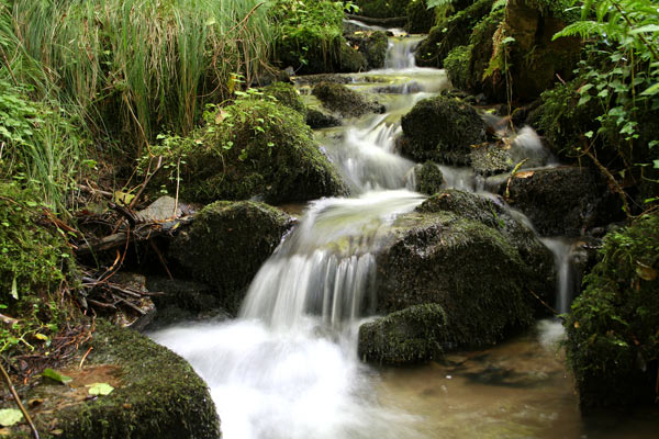 Hier nochmal ein Ausschnitt aus dem vorigen Bild. Da unser Bach von einem Blätterdach umgeben ist, herrschten hier diffuse Lichtverhältnisse. Ich habe auch mit höherer ISO-Zahl versucht, die Belichtungszeit etwas zu verkürzen