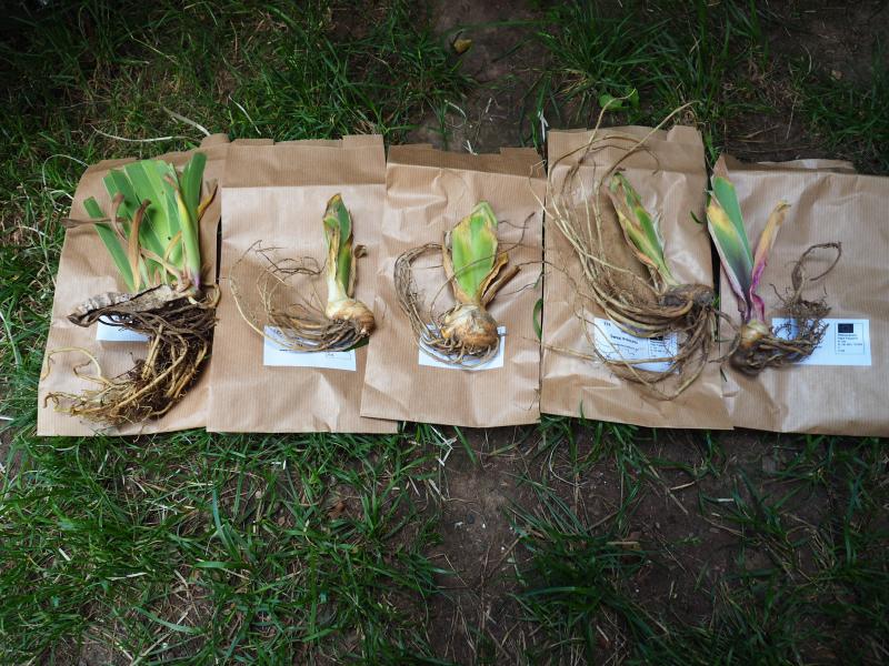 Heute kamen Iris von Hoch. Die Tüten kenne ich, die verwendet Marianne Joosten. So sahen die Iris dann auch aus. Aber gut, nur eine mit älterer Faulstelle und halb abgehacktem Mutterrhizom. Zwei waren von Loïc Tasquier, der züchtet Iris in den Niederlanden, Joosten verkauft seine Sorten. So sah die Lieferung aus.