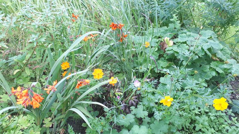 Montbretien und Cosmea sulfureus am Teich (trockenener Rand)