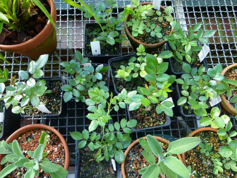 Hier ist der Nachwuchs meiner ungefüllten Rosen. Habe die Stecklinge etwas spät genommen, erst Juli, daher noch recht klein. Aber bei allen Sorten hat es mit den Stecklingen geklappt: