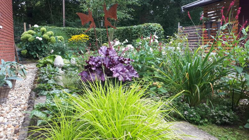 Auch ohne Sonne leuchtet der Garten wunderbar spätsommerlich, da möchte man sich doch gleich auf der Bank niederlassen und die Aussicht genießen! :D