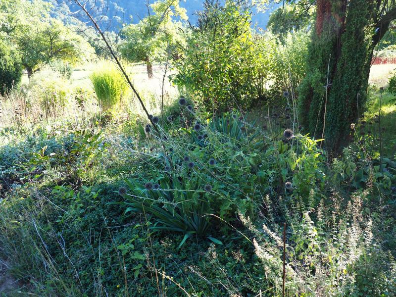 Echinops Bannaticus, alles Sämlinge, die ein besonders tiefes Blau haben. Im Hintergrund Stipa gigantea, dazwischen noch vereinzelt blaue Blüten von Vitex agnus-castus.