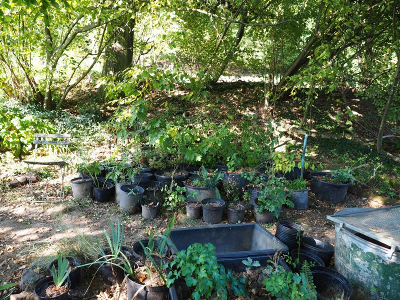 sehr schattig in der heißen Sommerzeit unter Laubgehölzen und der Boden ist am Kompostplatz von dunkel brauner Farbe, wie eben Hortisol oder Schwarzerde aussieht.