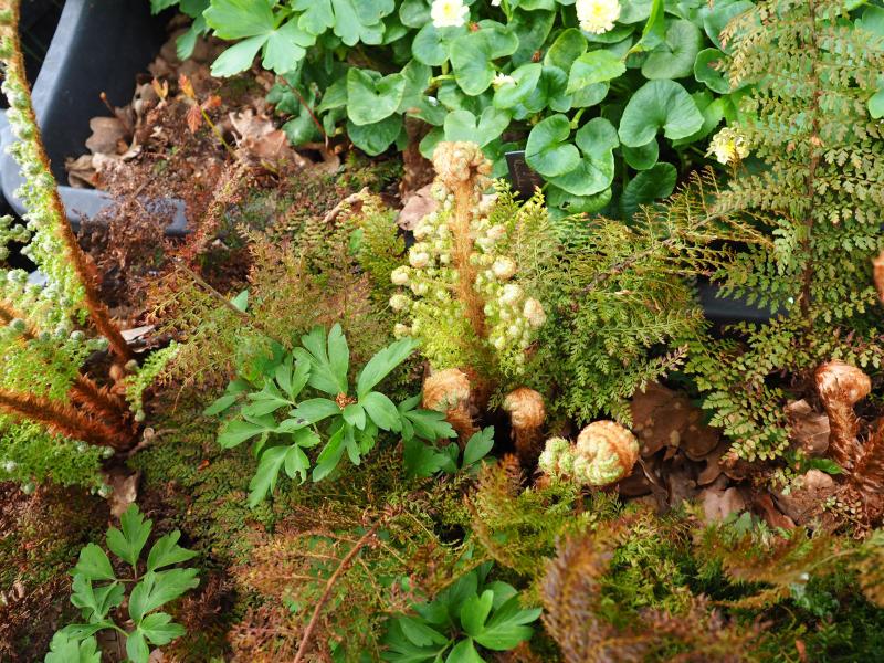 es gibt 6 Schildfarne, die ich in einer großen 60 l Mörtelwanne vorkultiviere. Die Exemplare habe ich in 9er Töpfen bekommen. Zwei Polystichum setiferum 'Plumosum Densum' oder Polystichum setiferum Plumosum Densum, als generativ vermehrte Exemplare.