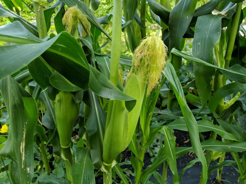 Dank Quendula wächst in unserem Garten erstmalig Blauer Popkornmais. Man sieht auf dem Bild einen deutlichen Gradienten in der Wuchshöhe, vielleicht durch zunehmenden Schatten und mehr Trockenheit rechts.