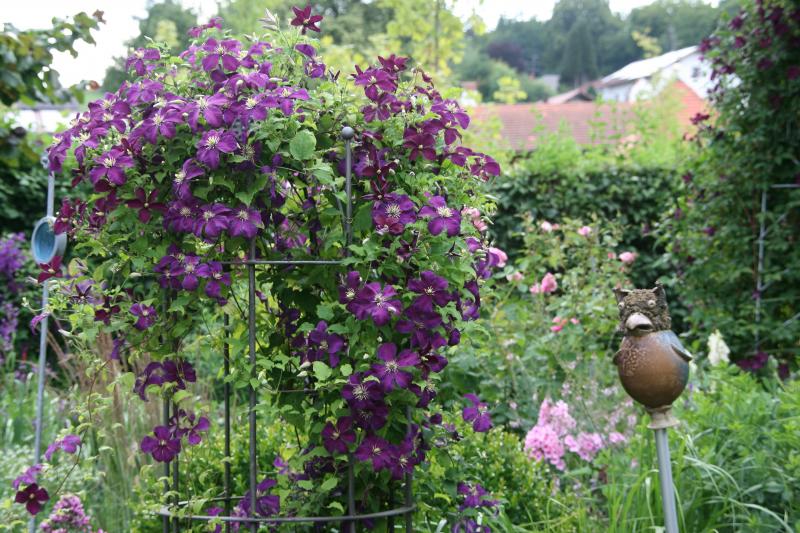 Dieses Foto ist von Mitte Juli, Cl. texensis 'Princess Diana', an den Fuß eines Rugosastrauches gepflanzt.