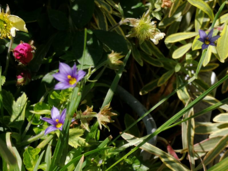 Für ein bißchen "Höhe" und weil ich die kleinen blauen Sternchen so mag, wächst dort auch noch Sisyrinchium littorale.