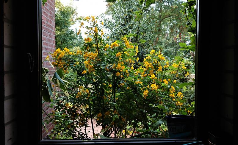 Auf der anderen Seite geht es mehr um das Fensterbrett - das Heidekraut in diesem Gefäß ist eine jährlich wiederkehrende Konstante im August :) Inzwischen ist der Apfelbaum so dicht, daß man aus diesem Blickwinkel den Wald nicht sieht.