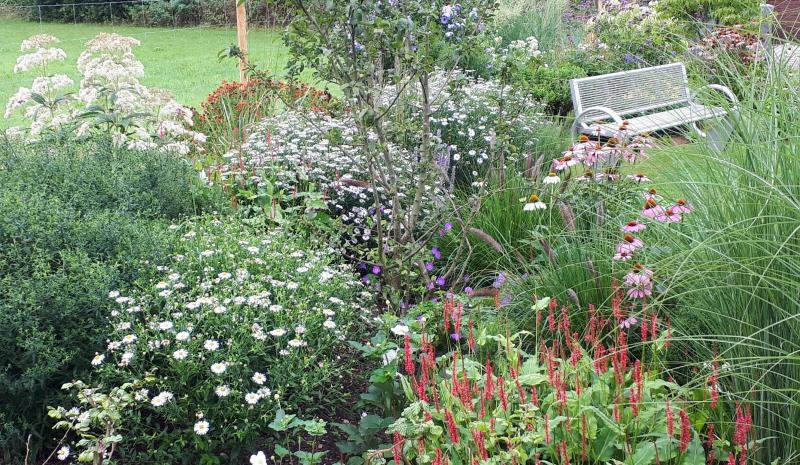 Neues Grenzbeet mit Zierapfel 'Red Sentinel' .