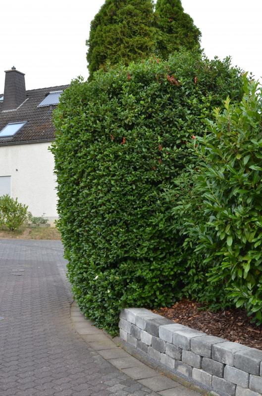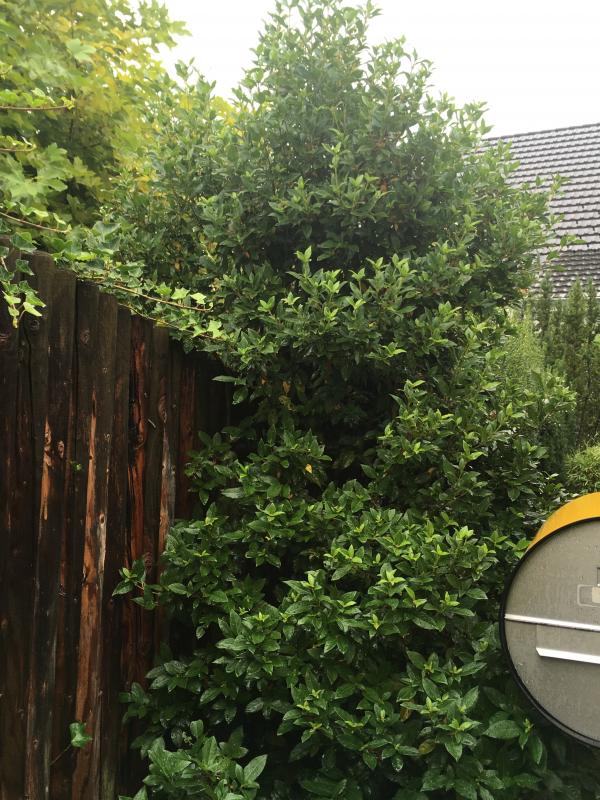 Der Viburnum tinus wurde wohl in diesem Jahr in der Höhe eingekürzt, daher die braunen Blätter oben. War bestimmt 3 Meter hoch, jetzt geschätzt 2,50m. Seitlich wird er regelmäßig mit der Heckenschere geschnitten (Straßenecke!) und ist sehr dicht. Im Frühjahr 2012 war er stark frostgeschädigt und musste fast von unten wieder hochwachsen.