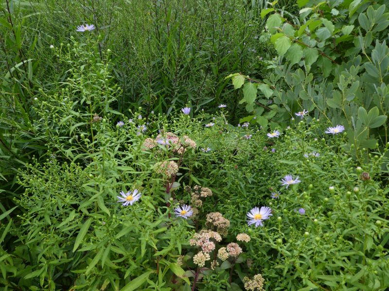 Es gibt schon einige Gehölze im Beet. Hinter den Sedum. Herbstfreude steht eine rotlaubige Fasanenspiere. Ich suche mir einmal kleine Berberitzen raus und schau mir das im nächsten Jahr einmal an. Dieses Jahr ist das Gartenbudget ausgeschöpft.