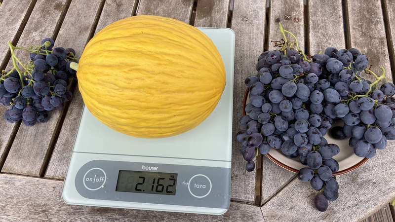 Das Gewicht entspricht genau den Züchterangaben, alle sind zwischen 2 und 2,5kg schwer. Leider kein eingebauter Reifeanzeiger, der Stiel löst nicht. Man muss sich die Schale genau ansehen und klopfen. Duft auch unauffällig. Diese Melonen sind auf Haltbarkeit und Transportfähigkeit gezüchtet, die Schale ist fest und sie hat auch ohne Schutz keine Liegeschäden. Angeblich halten sie wochenlang.