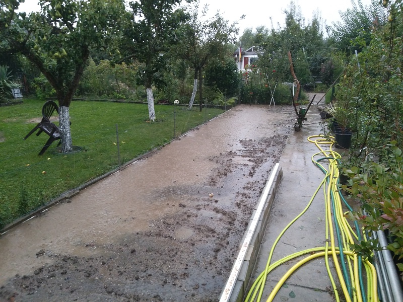 Das entmischen von Humus und Bodenpartikeln hätte ich gerne vermieden. Wieder andrücken hätte ich gemacht wenn es 10 Minuten später erst geschüttet hätte und ich gewusst hätte das eine ganze Ladung runterkommt. Gemeldet waren 0mm.